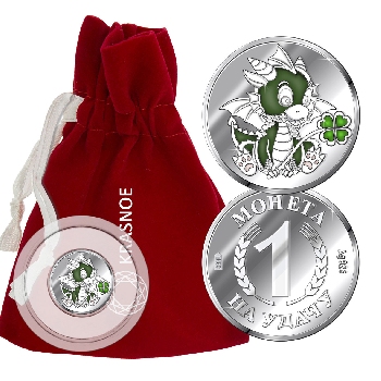 Серебряная монета с зелёной эмалью с изображением Дракона. Символ года.