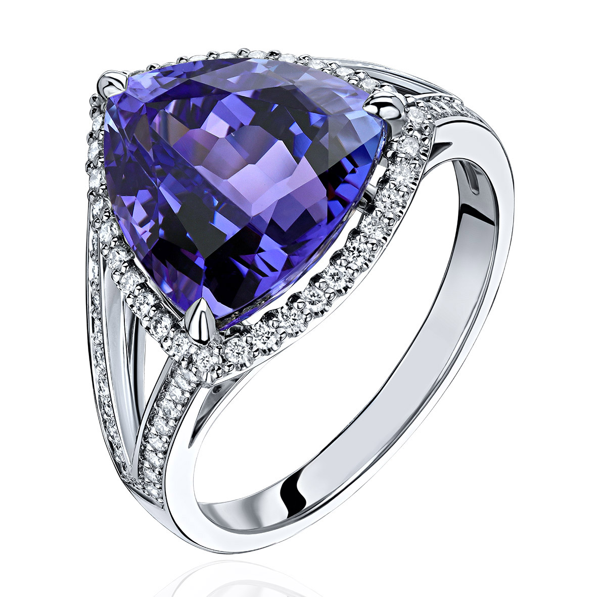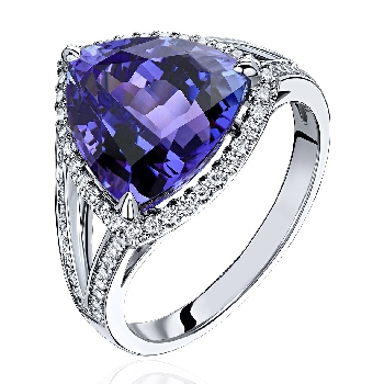 Огранка триллион. Каст на 3 крапанах, изящный и почти незаметный. Россыпь камней по периметру всего камня, плавно переходящая двумя независимыми линиями в шинку - как символ высокого уровня ювелиров, кропотливо воплотивших данное произведение ювелирного искусства в жизнь.