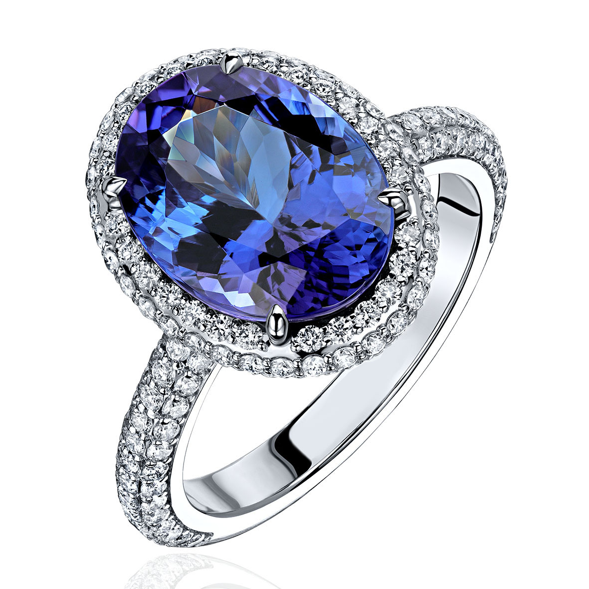 Кого удивишь крупным танзанитом? Наших искушённых и прекрасных покупательниц уже точно нет. Поэтому мы решили удвоить роскошь и блеск бриллиантов в данном изделии и разместили их в два ряда вокруг самого камня, а также в 3 ряда по периметру всей шинки кольца.