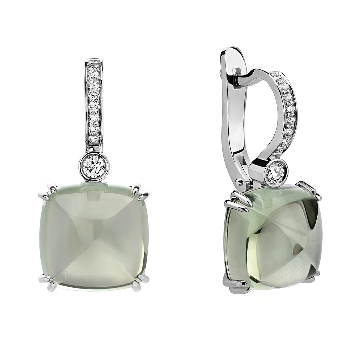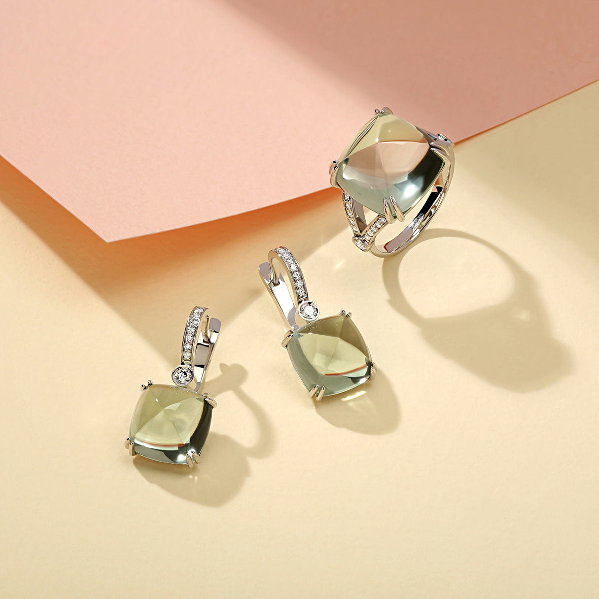 Празиолит создан вулканическими породами, таит в себе невероятную силу стихии при всей своей внешней нейтральности. Фантазийная огранка Sugarloaf придаёт камню загадочности и глубины.