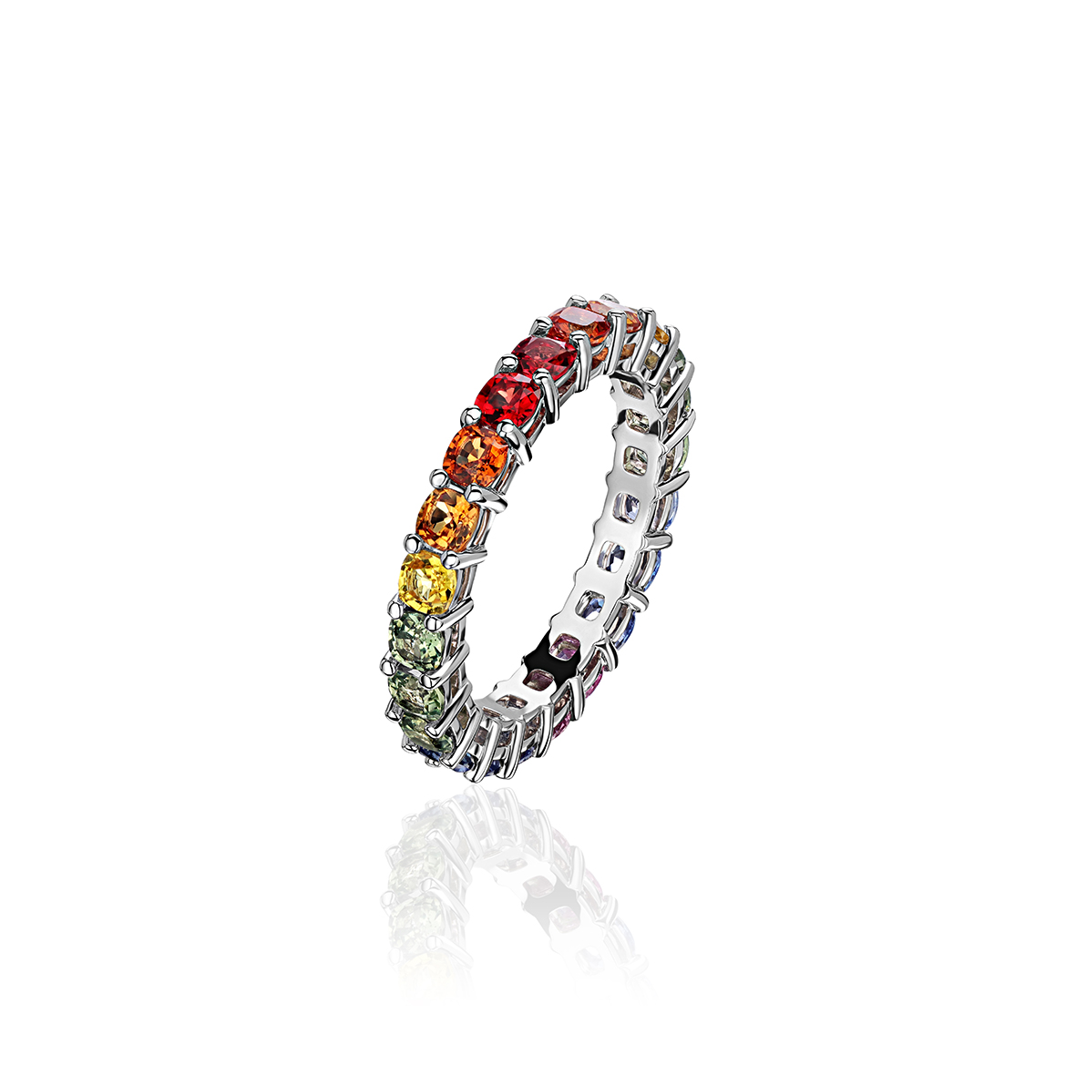 Яркий всплеск цвета всех спектров цветовой гаммы благодаря искусной работе наших ювелиров вместившийся в одно целостное изделие. Камни подобраны один к одному по цвету сапфиров в кольце и серег. Эксклюзивная работа геммологов и огранщиков камней фабрики.
