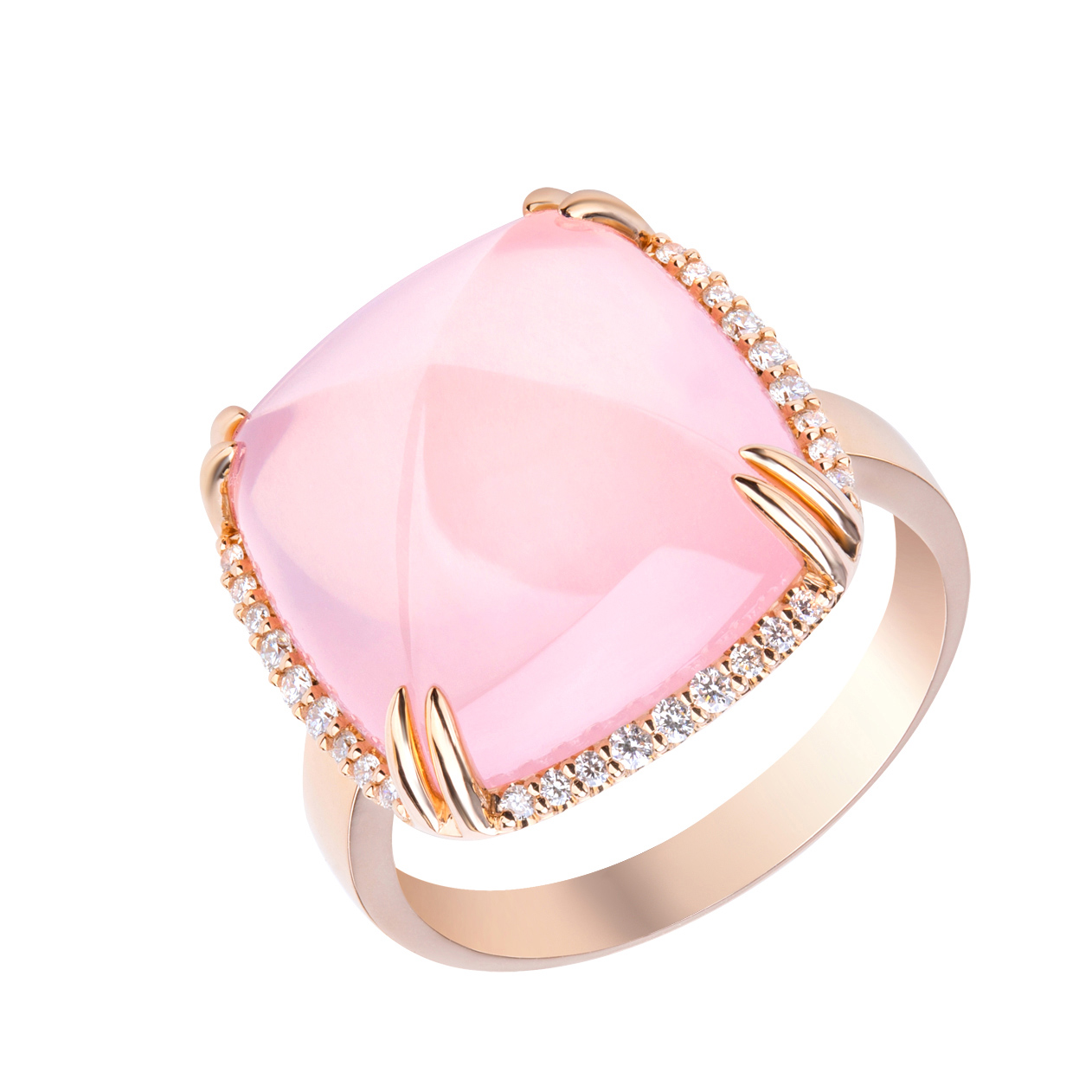 Почти плюшевый комплект с кварцем и бриллиантами. Огранка sugarloaf в сочетании с ярко розовым цветом камней создаёт эффект плюшевости, «мягких подушечек».