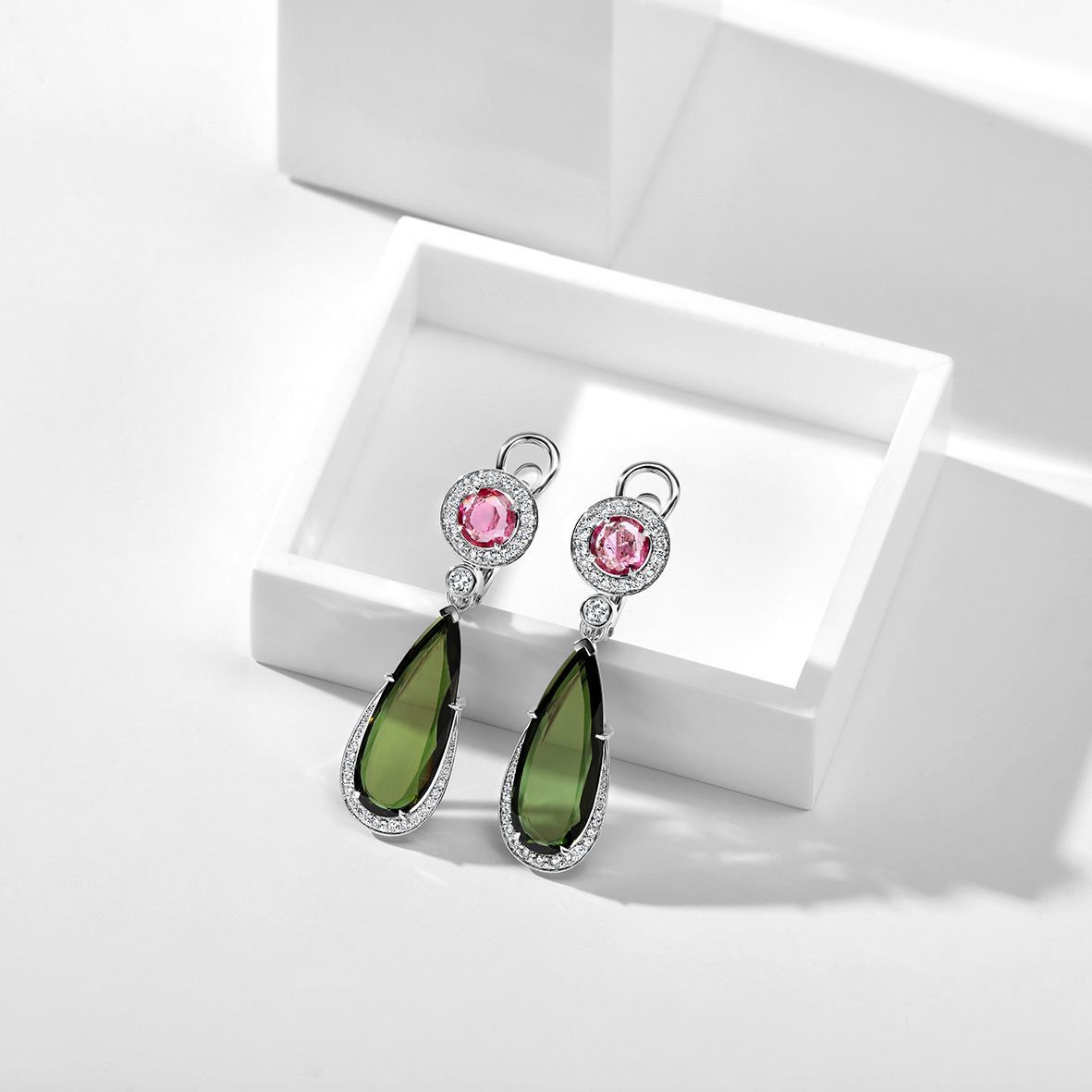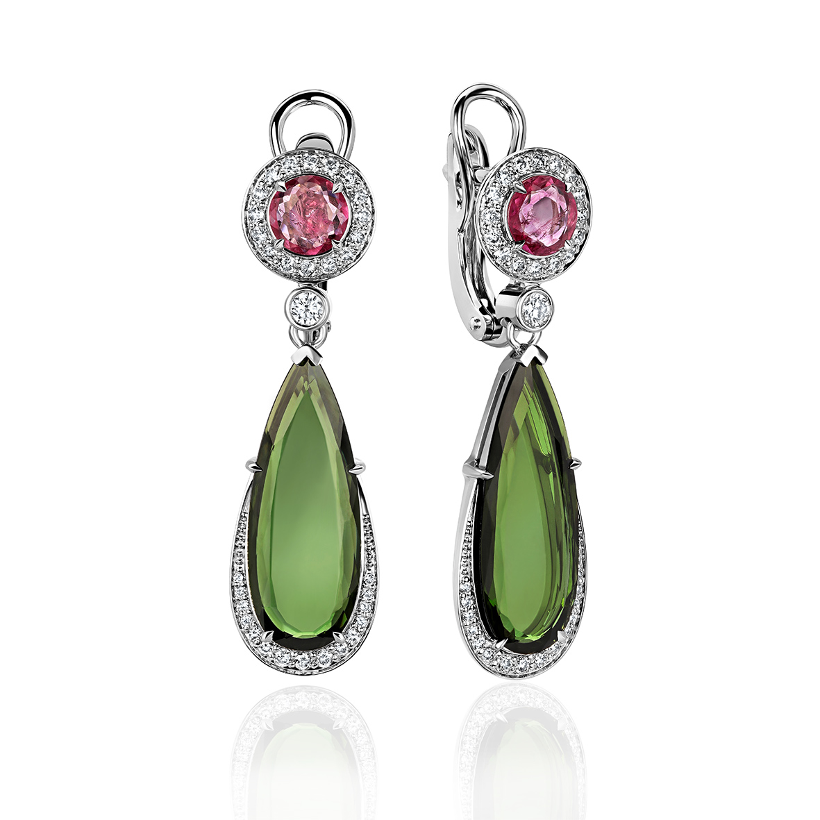 Сочетайте контрасты, будьте яркой. Розовый, зеленый и холодный белый - вызывающее и вместе с тем столько гармоничное сочетание, благодаря кропотливой работе наших дизайнеров и ювелиров. Каплевидные турмалины подчеркнут изящность шеи и линии подбородка, розовые турмалины создадут необходимые акценты на мочках ушей, выделяя серьги на фоне волос, а богатство бриллиантов подчеркнет Ваш особый статус и безупречный вкус