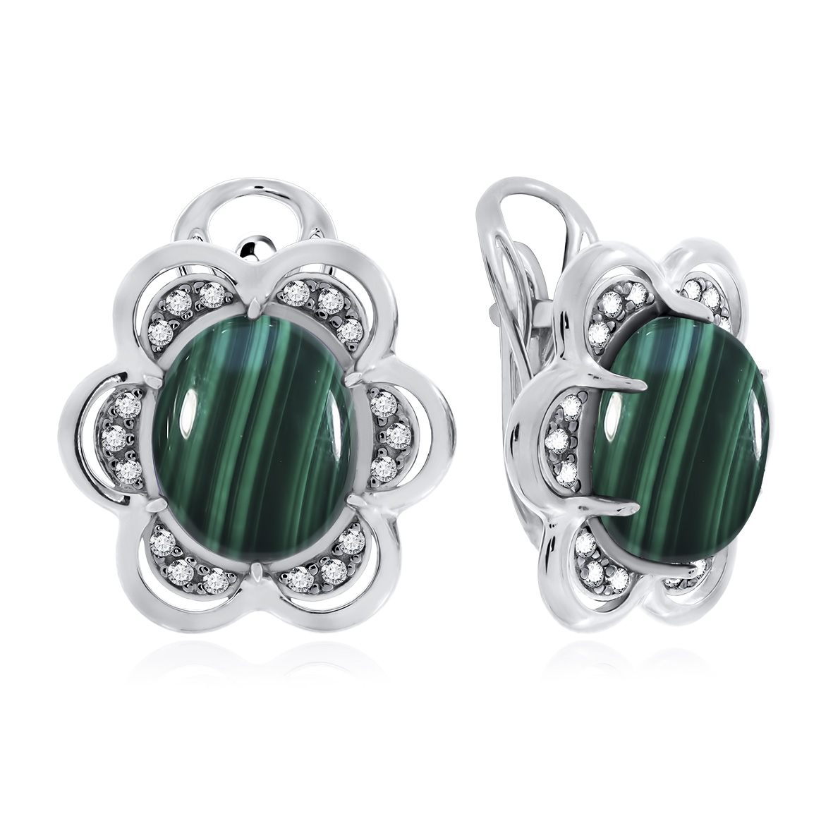 Серьги для женщин из серебра 925 пробы с малахитами,фианитами из коллекции Уральские самоцветы артикул 2348381882л от компании KRASNOE
