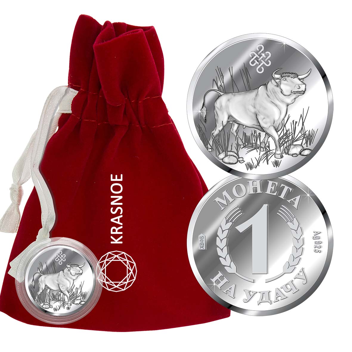 Серебряная монета с изображением Быка. Символ года. Бык был покровителем 1901, 1913, 1925, 1937, 1949, 1961, 1973, 1985, 1997, 2009 и 2021 года. В следующий раз он станет символом 2033 и 2045 годов.