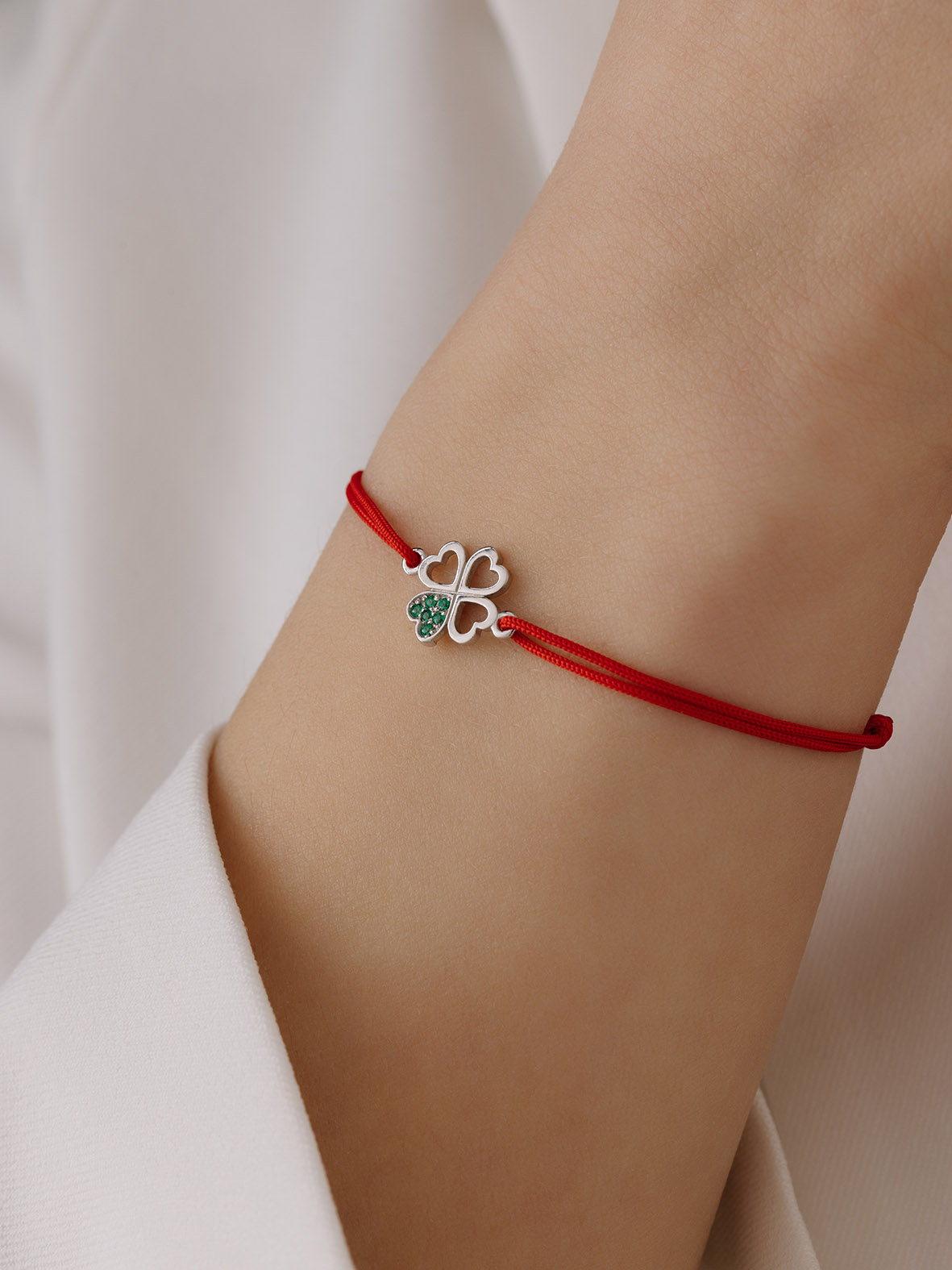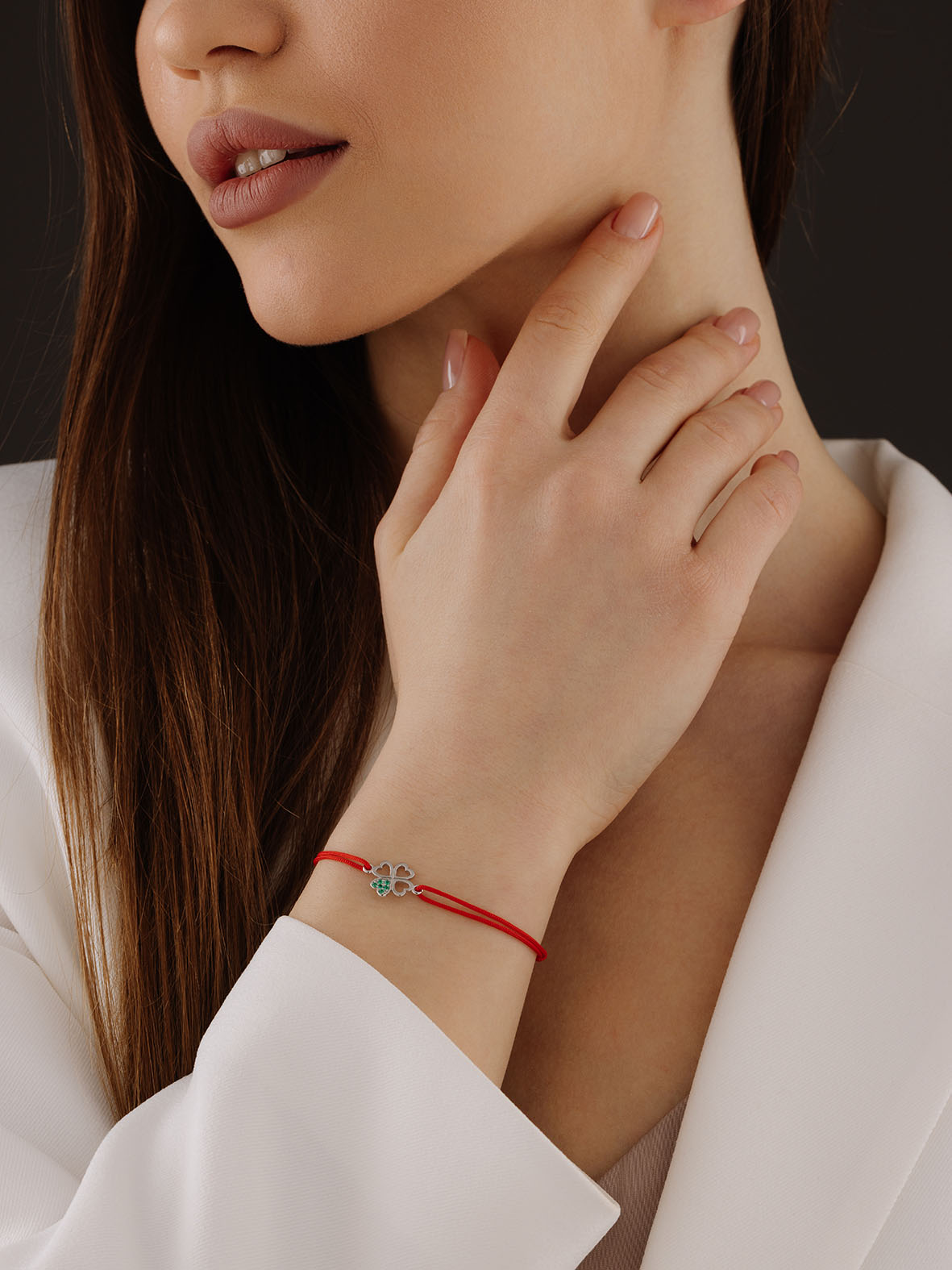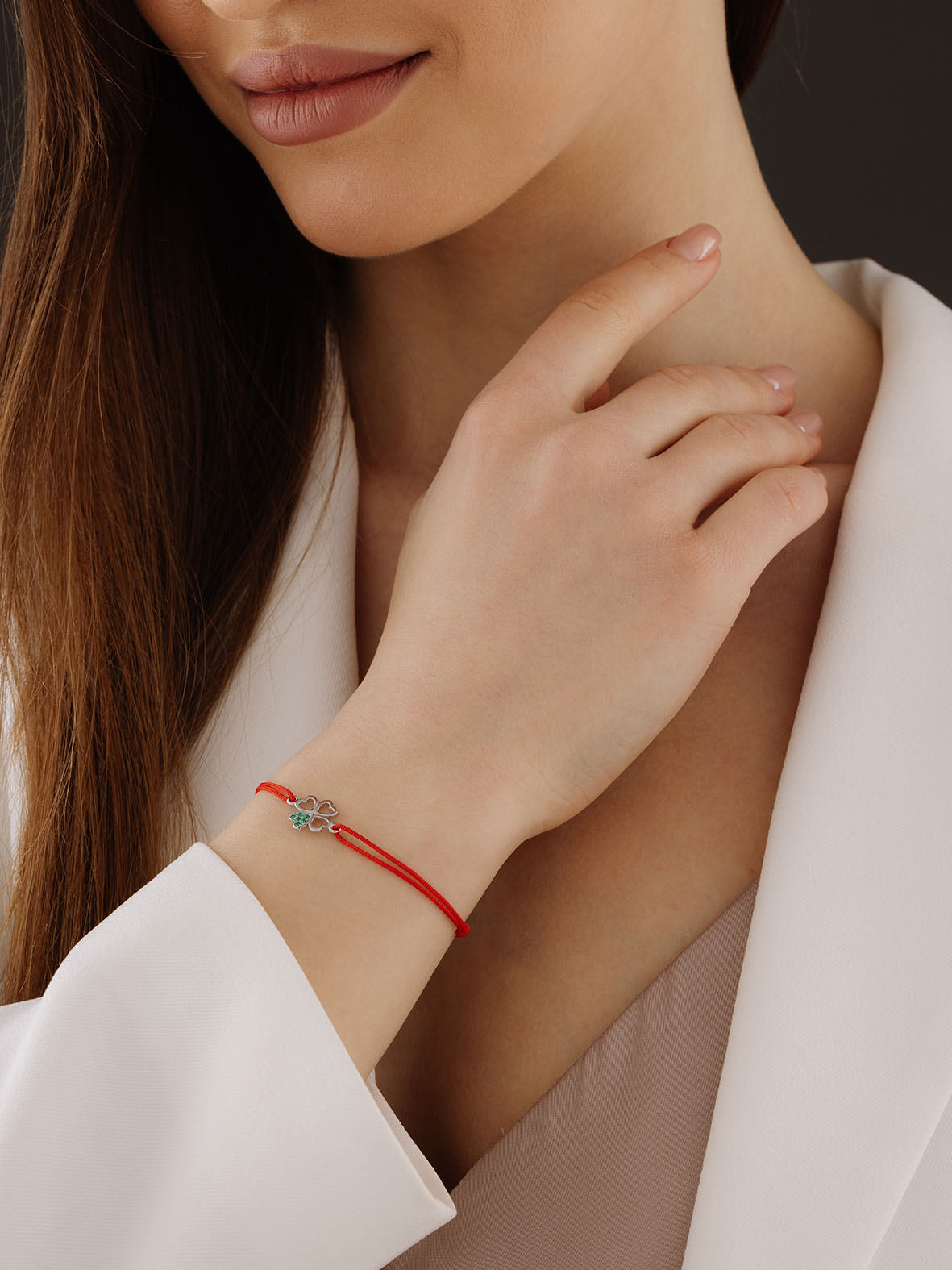 Стильный и трендовый браслет желаний на красной нити с лепесточками клевера с яркими фианитами, станет ярким украшением вашего образа! Носите его с любым нарядом, дарите в подарок близким и друзьям. Наш браслет на красной нити - это не только элегантное минималистичное украшение, но и сильный оберег от сглаза, воздействия отрицательной энергии. Каждый браслет выполнен вручную и несет в себе положительную энергию моря и солнца. Наденьте его и загадайте желание! Обещаем, оно сбудется. Подходит всем: без ограничения по возрасту и полу. Красная нить браслет, красная нить с серебром, красная нить на руку, красная нить от сглаза, на запястье, красная нить оберег, красная нить мужской браслет, женский браслет, браслет ребенку. Размер клевера 1,1*1,1см. Размер вставки фианит зелены 1,25см.